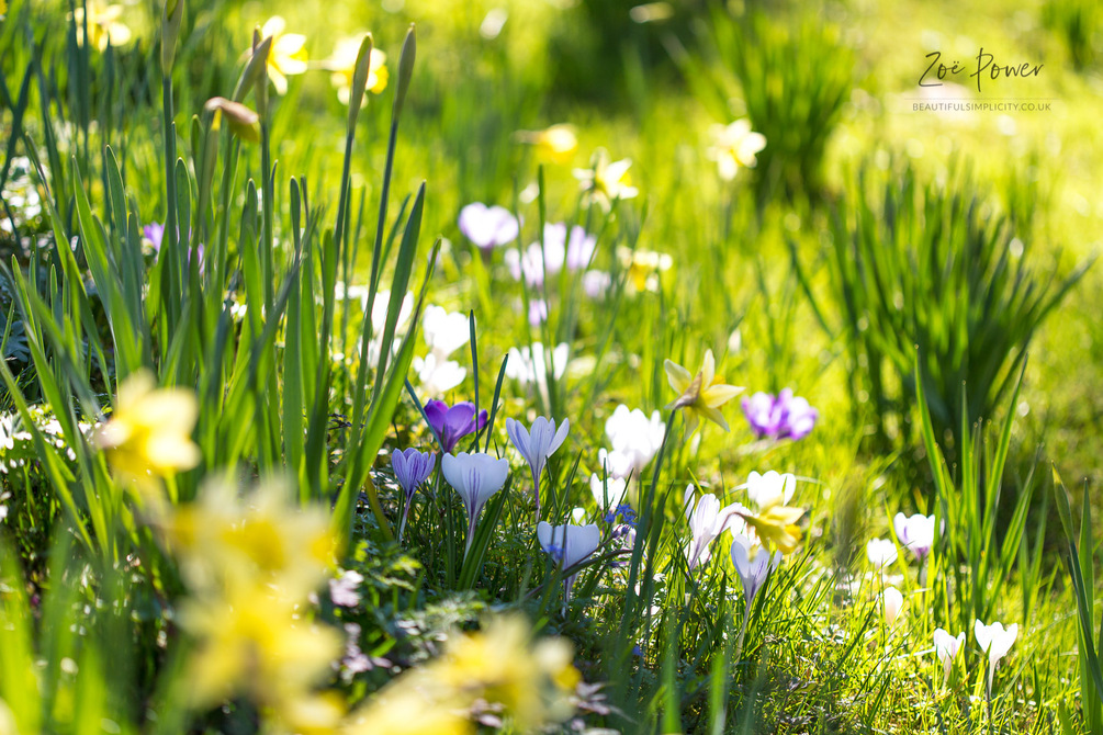 Photographs include: (1) Crocuses and daffodils in a meadow (2) Daffodils in the grass (3) Pink Cherry Blossom branch.