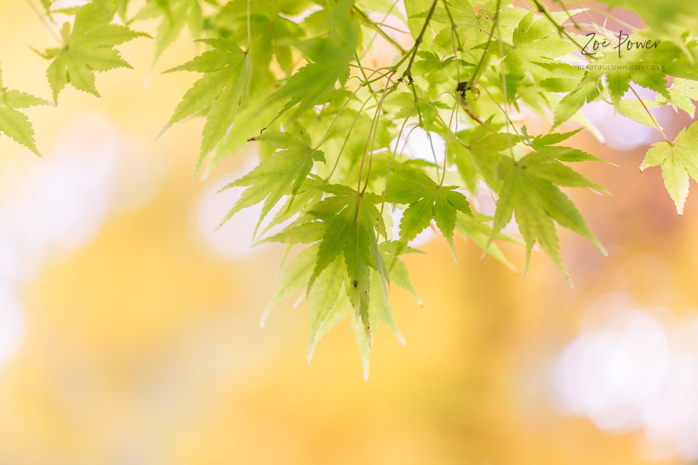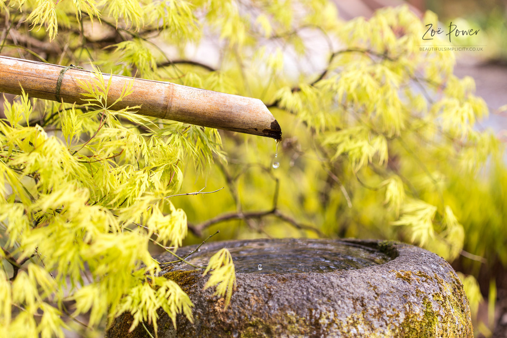 Photographs include (1) White Cherry Blossom, (2) Field of Ox-eye Daisies, (3) Bluebell woodland, (4) Zen bamboo fountain, (5) Green Acer leaves on yellow background.